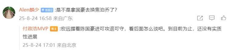 对于这种情况,有球迷在社媒上询问付政浩,付政浩对此回复道:“我说了宏远拿下陈国豪是进可攻退可守,现在就看看朱总有没有魄力了。”