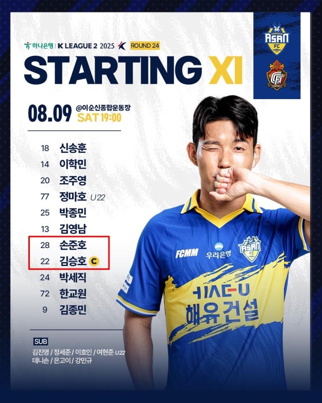 在昨日进行的K2联赛中,忠南牙山2-2主场打平庆南,孙准浩(球衣号码28号)继续首发,但场上的队长却是22号金承浩。