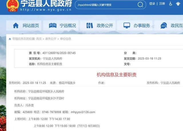 极目新闻记者注意到,在宁远县政府官方网站上,明确写着棉花坪瑶族乡政府7月1日-9月30日的上班时间为上午8:00-12:00、下午3:00-6:00。
